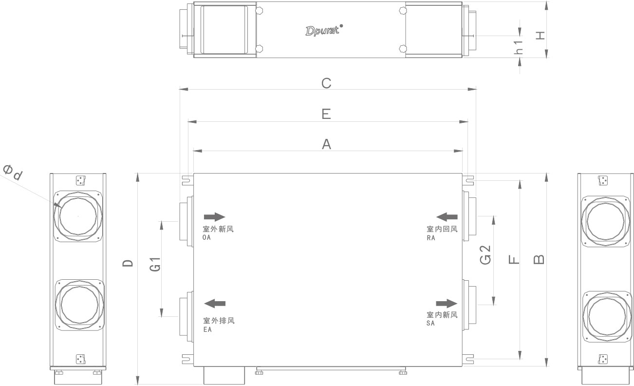 | 型号 | A | B | H | C | D | E | F | G1 | G2 | H1 | Фd |